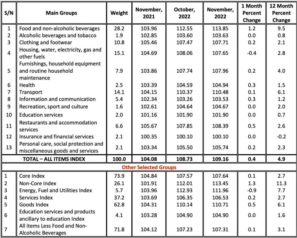 The National Consumer Price Index (NCPI) for November 2022 has increased to 109.16 from 108.73 which was recorded in October 2022.