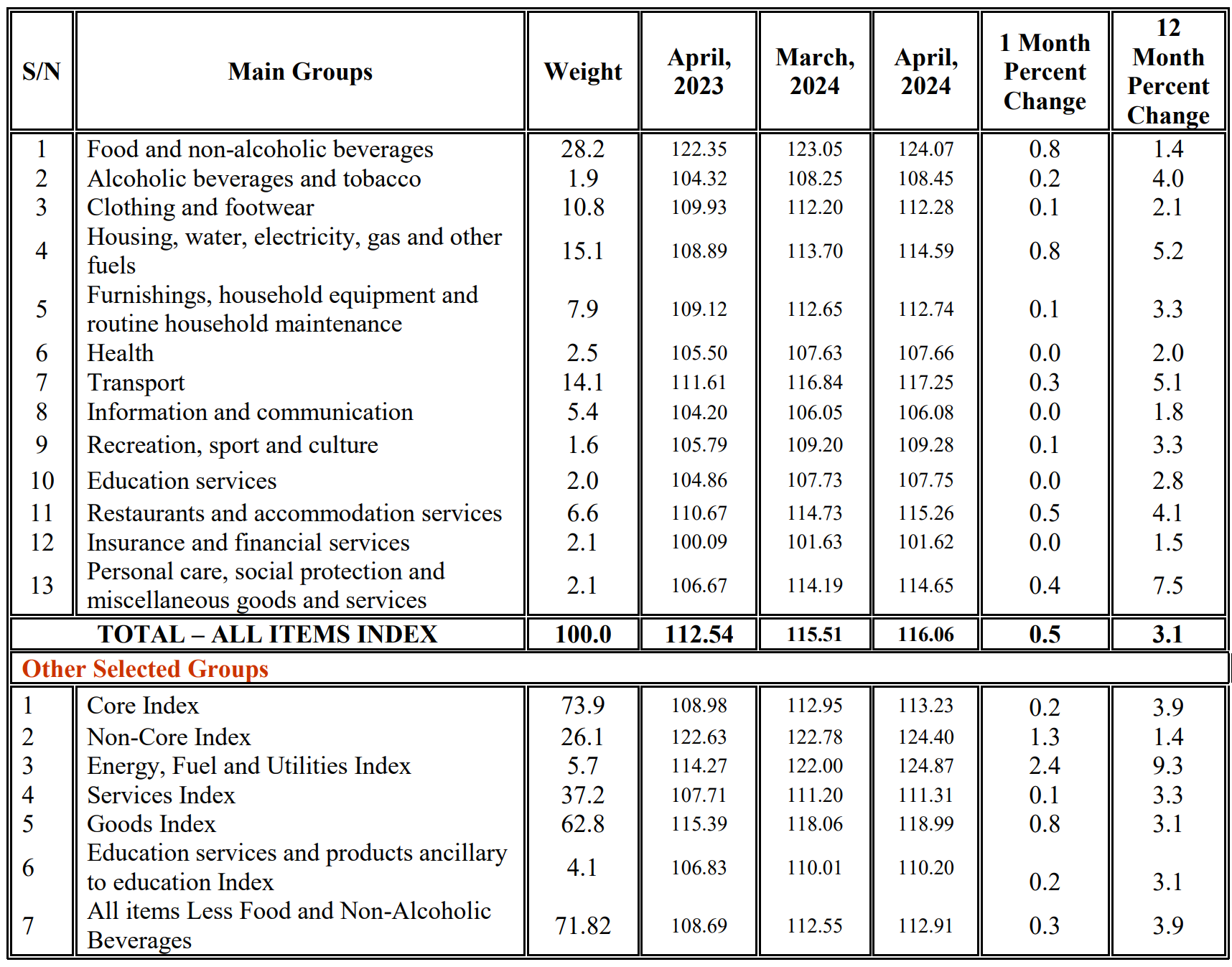 The overall index went up from 112.54 in April 2023 to 116.06 in April 2024.