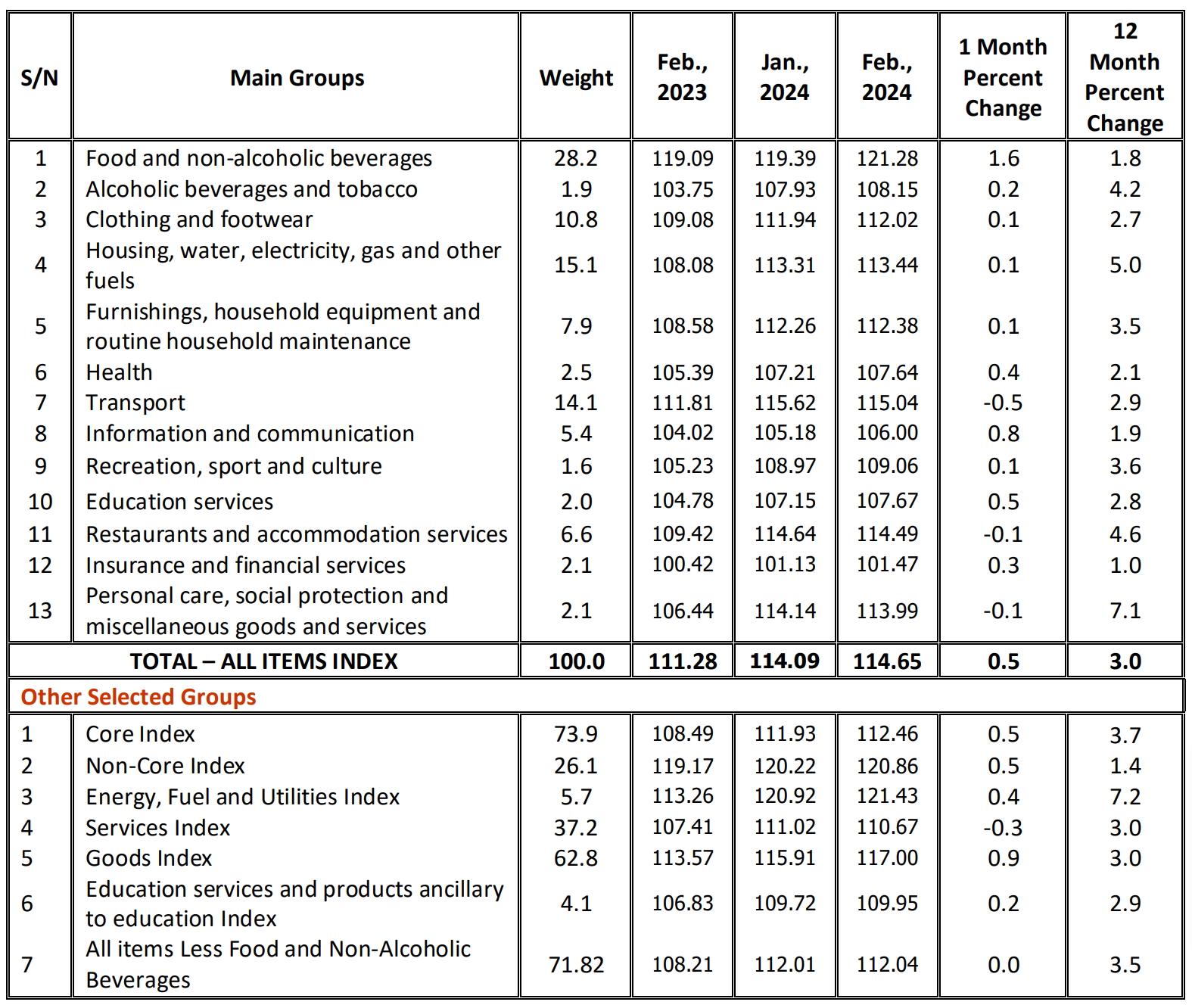 The National Consumer Price Index between January 2024 and February 2024 has increased by 0.5%. The increase in the overall index is attributed to price increases for some food and non-food items.