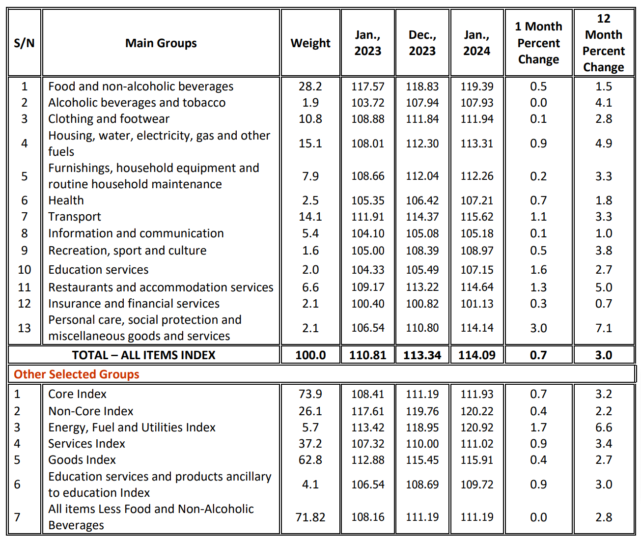The National Consumer Price Index between December 2023 and January 2024 has increased by 0.7%. The increase in the overall index is attributed to price increases for some food and non-food items.