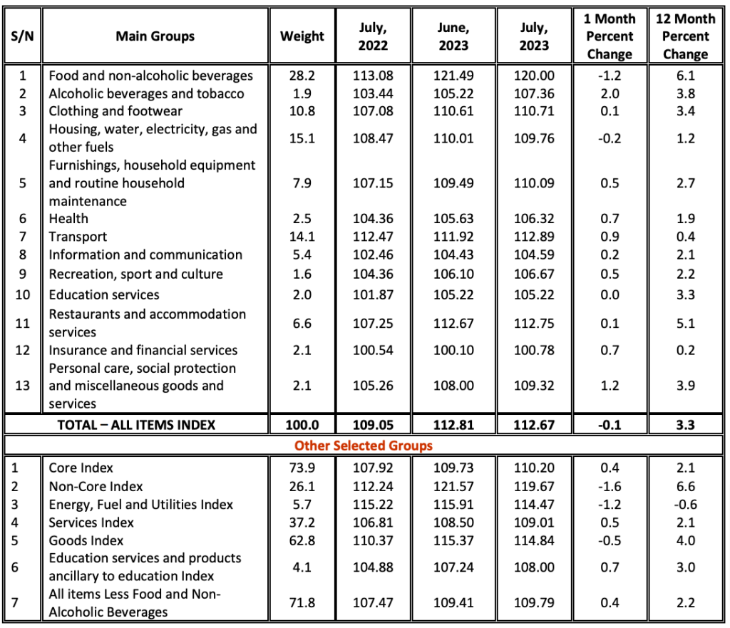 The National Consumer Price Index for July 2023 has decreased to 112.67 from 112.81 which was recorded in June 2023.
