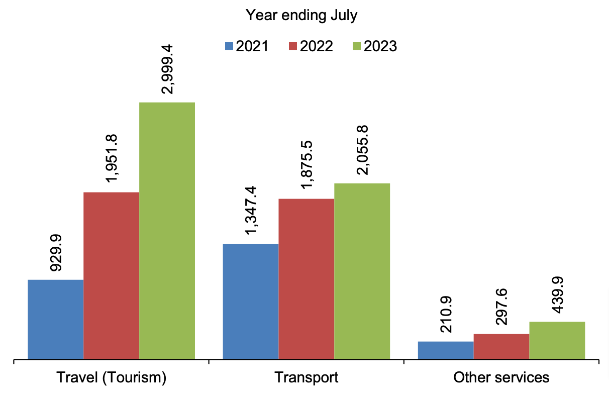 Services receipts increased to USD 5,495.2 million in the year to July 2023 from USD 4,125 million in the year ending July 2022, driven by travel (tourism) and transportation receipts.
