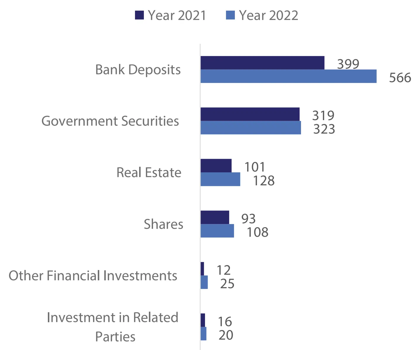 a) Bank Deposits (48.4%). The largest portion of insurers’ investment assets was allocated to bank deposits, which encompassed term deposits and cash balances. This category accounted for 48.4% of the total investments. The focus on bank deposits underscores insurers’ cautious approach to liquidity management and the safeguarding of capital.