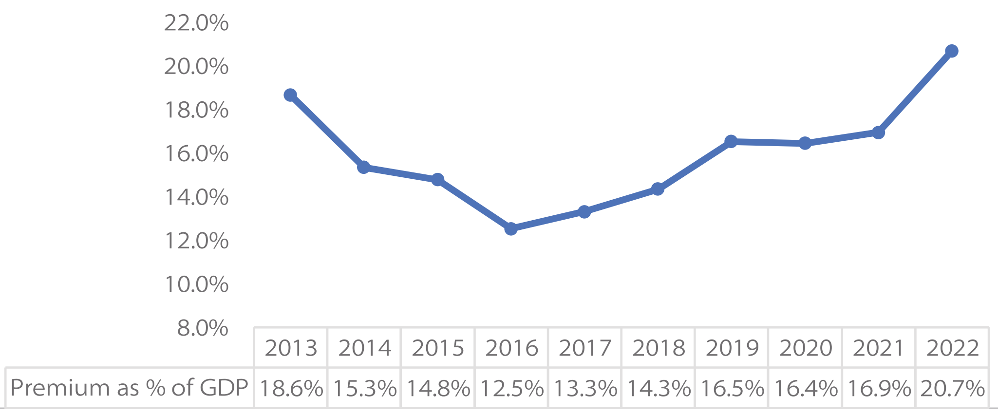 The industry’s management expense expenses as the percentage of the gross written premium showed slight changes, with the ratio increasing slightly to 45.4% in 2022 from 45.2% in 2021. These ratios were far above the international benchmark of 25.0%.