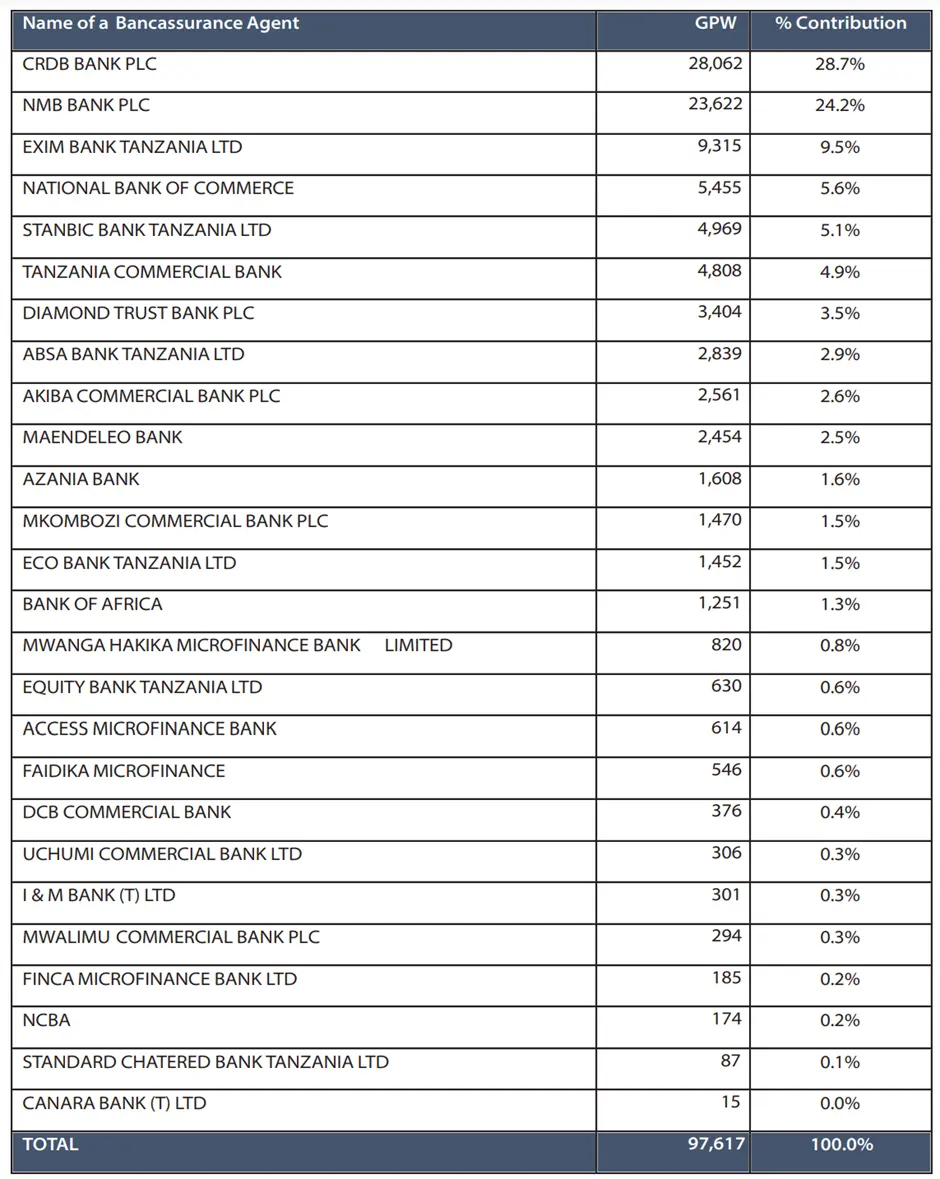 ln 2022, almost half of bancassurance agents’ share of life assurance business was held by Tanzania’s largest banks: CRDB Bank with 47.4% (2021: 25.9%). It was followed by MNB Bank with .3% (2021: 54.4%), and NBC Bank with 12.1% (2021: 9.4%). These bancassurance agents collectively handled about 80.8% (2021: 89.7%) of the entire bancassurance life assurance business in Tanzania.