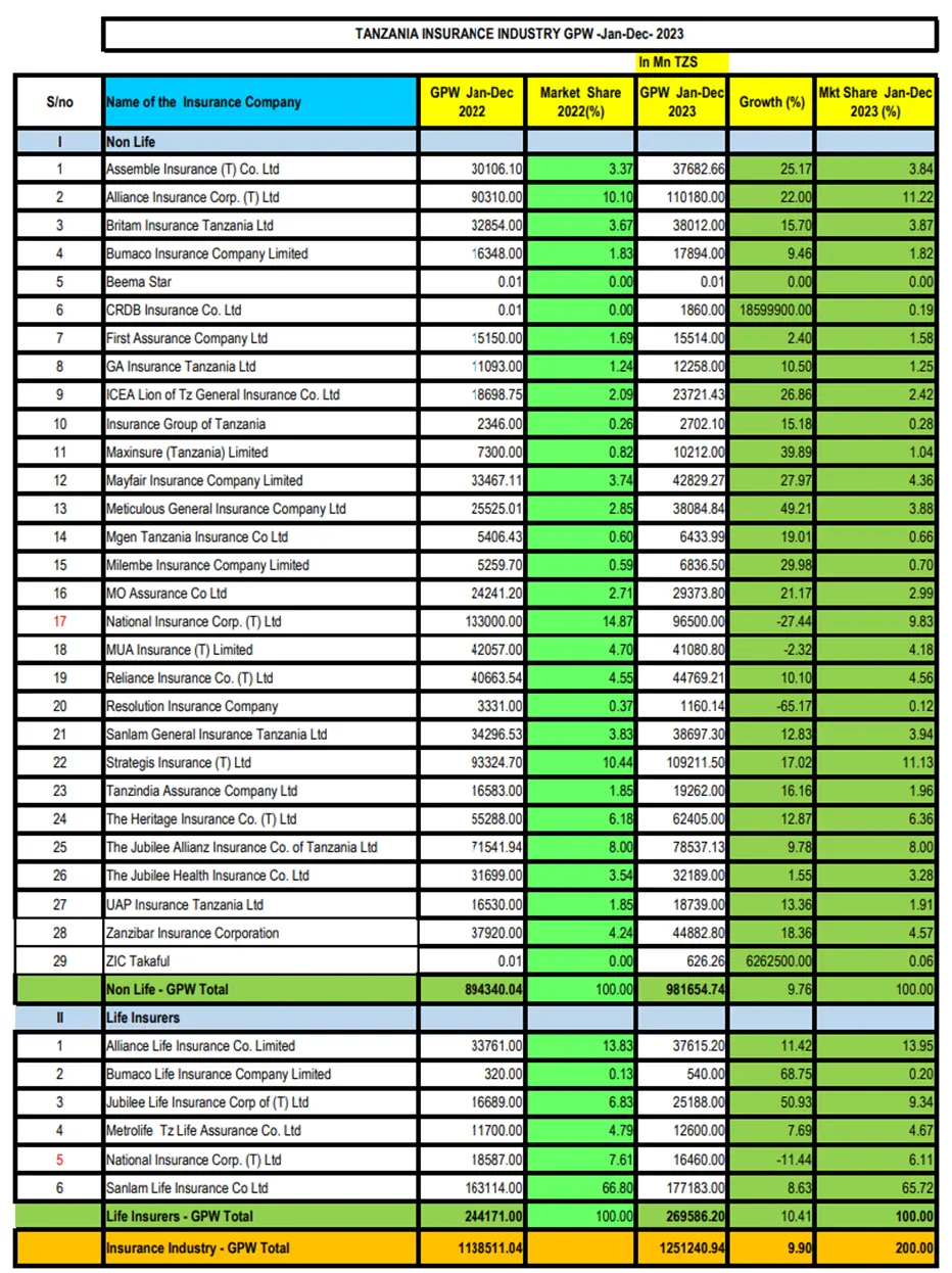 Tanzania Insurance Gross Written Premium GWP by Company, 2022-2023