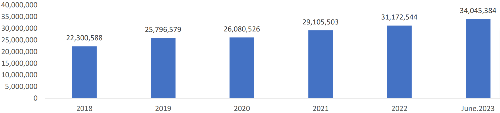 Total internet subscriptions reached 34,045,384 in June 20233 from 33,090,834 in March 2023.