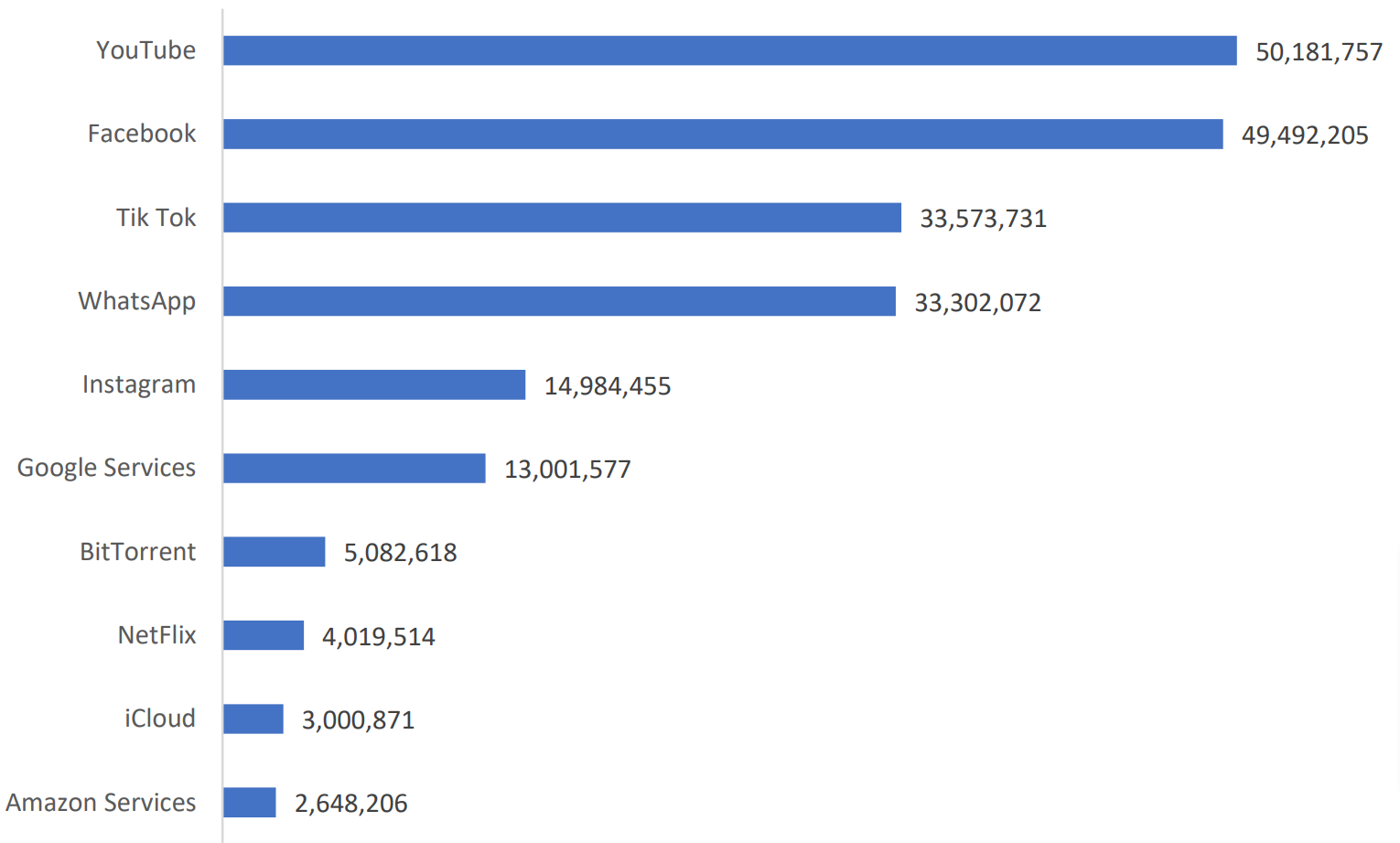 Third was the video hosting service TikTok with 33.57 million GBs.