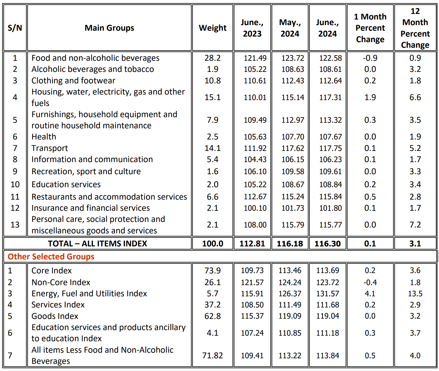 The Core Index covers 297 items and the share of weight to total NCPI weight is 73.9%. The inflation rate for the Core Index in June 2024 has also stagnated at 3.6% as recorded in May 2024.