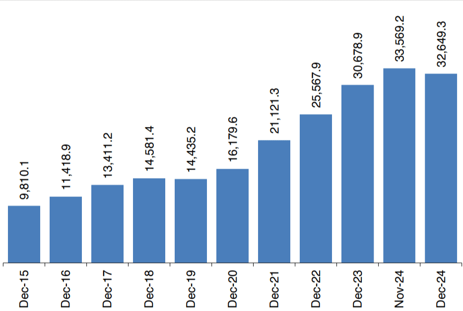 The stock of external debt decreased by 1.8% to USD 32,928.4 million at the end of December 2024, compared with the level recorded at the end of the preceding month.