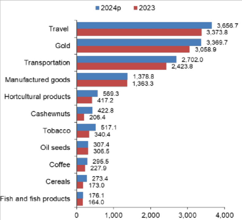This growth was attributed to higher exports of gold, cashew nuts, tobacco, horticulture products, coffee, and fish and fish products.