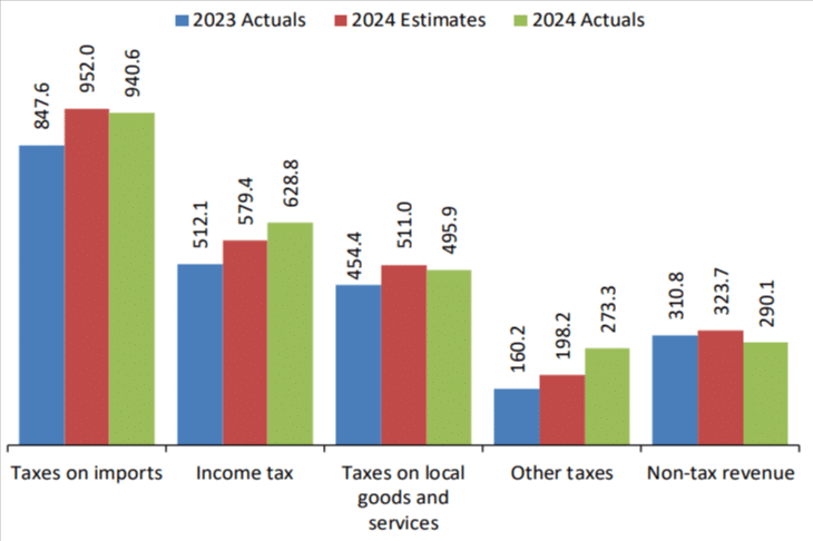 Tax revenue outperformed the target by 4.4%, reaching TZS 2,338.5 billion, with the outturn largely driven by income tax and other tax categories.