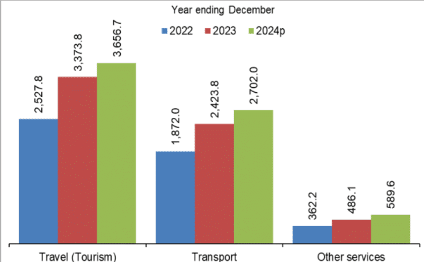 In 2024, service receipts increased by 10.6% to USD 6,948.2 million, up from USD 6,283.7 million in 2023, following higher receipts from tourism (travel) and transportation.