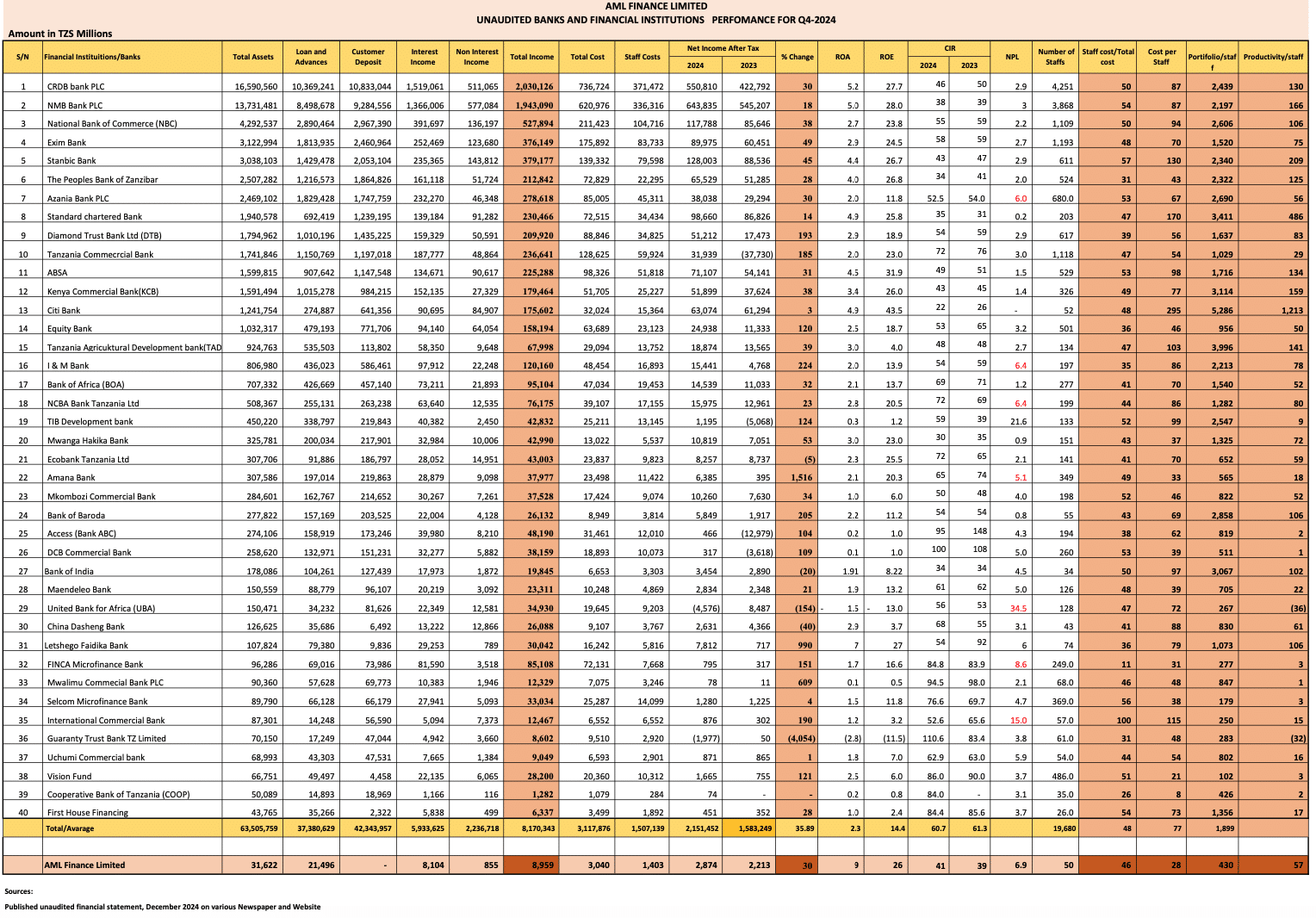 According to AML Finance’s Q4 2024 analysis, the Tanzanian banking sector demonstrated substantial growth in assets, revenue diversification, and deposit mobilization.